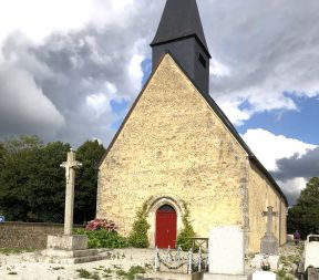 A small contemporary church that succeeds two older churches. The semi-circular porch is surmounted by a curious ogival tympanum with trompe-oeil decoration.
