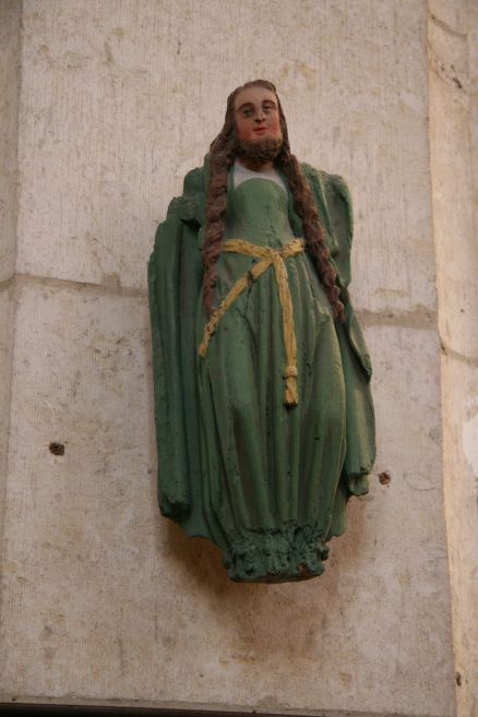 Vous êtes devant sainte Wilgeforte, la sainte barbue crucifiée, curieuse et rare représentation qui apparaît au XIVe siècle.
