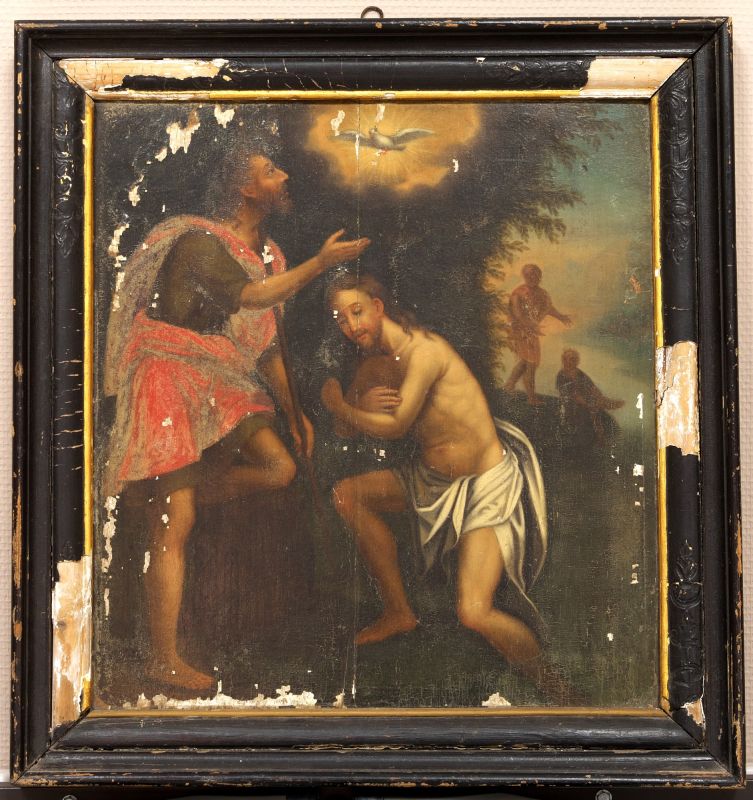 Autrefois placée dans la chapelle des fonts baptismaux, cette petite huile sur panneaux de bois date du XVIIIème siècle et est inscrite au titre des Monuments Historiques depuis 1973. L’artiste anonyme représente la scène du Baptême du Christ par son disciple Jean-Baptiste. Il place les personnages dans un décor végétal abondant et éthéré. Dans une gloire rayonnante, le saint Esprit figuré par une colombe surplombe et éclaire la scène. Le manteau du baptiste est en rouge, seule couleur dominante du tableau.