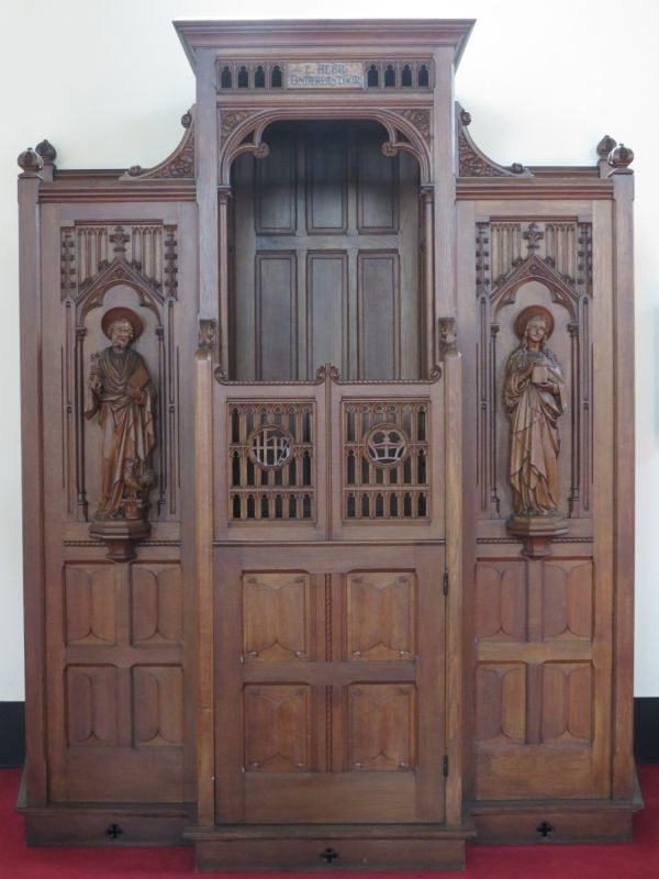 De biechtstoel tegen de zuidermuur is versierd met briefpanelen. Op de klapdeurtjes zitten opengewerkte boogjes en een Christus- en Mariamonogram. Links zie je het beeld van de Heilige Petrus, met boek, sleutels en een kraaiende haan. Rechts de Heilige Maria Magdalena met een kruik balsemolie. Beide verwijzen naar het berouw over de zonde.