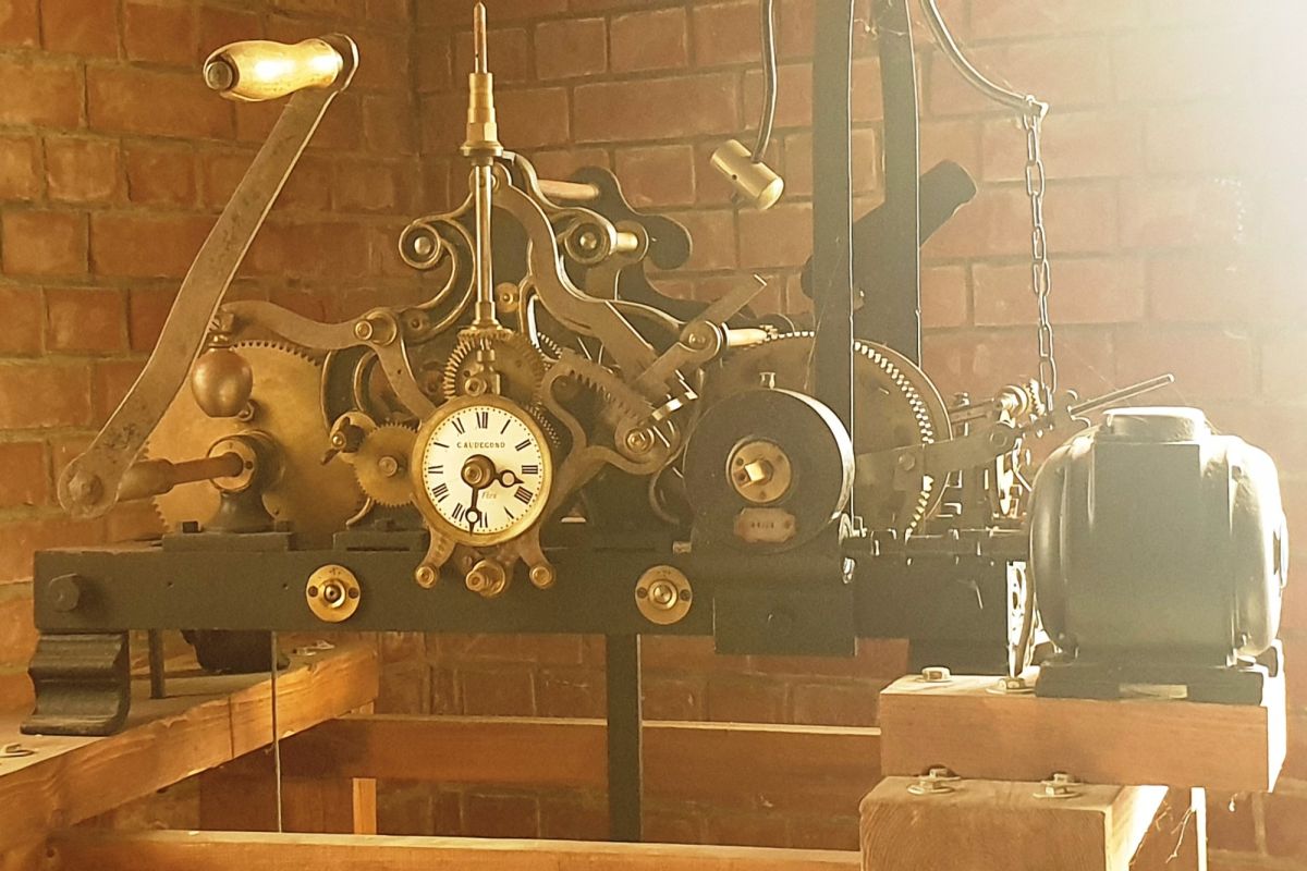 Oud klokmechanisme met slinger en contragewicht, bedoeld om in een kerk te worden gemonteerd. Op de instelknop staat de naam van klokkenmaker C. Audegond geëmailleerd. Deze zou in de 18e en 19e eeuw hebben gewerkt en zijn atelier was waarschijnlijk gevestigd in La Fère in het departement Aisne.