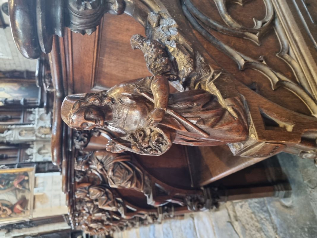Deze eikenhouten neogotische koorstoelen werden in de tweede helft van de 19e eeuw gesneden door de werkplaatsen Buisine-Rigot in Lille. Ze werden ontworpen om plaats te bieden aan de geestelijken, misdienaars en leden van het kerkbestuur. Hun onderscheidende kenmerk is de voorstelling van 72 zorgvuldig gebeeldhouwde heiligen.