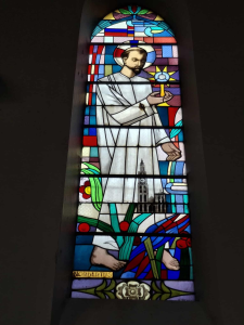 De kerk valt op door haar vele kleurrijke en originele glas-in-loodramen, waarop bekende en minder bekende heiligen zijn afgebeeld. Het was pater Jérôme Deknudt van de orde van de Premonstratenzers, pastoor van de parochie van 1958 tot 1968, die deze glas-in-loodramen liet plaatsen. Hij was zijn tijd ver vooruit en was een van de eersten die Johannes XXIII, initiatiefnemer van Vaticanum II, en pater Damiaan eerde, lang voor hun heiligverklaring. Ze zijn afgebeeld rond de heilige Jozef, boven de ingangspoort.